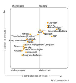 En este informe, Gartner ha reconocido como Líderes a Microsoft, Oracle, MicroStrategy, IBM, Information Builders, SAS, QlikTech (que en 2010 ha pasado a esta categoría de Líderes, cuando en 2009 figuraba en el cuadrante de Challengers) y SAP ; en la categoría de Challengers ha situado a Tableau y Tibco Software; y en el área de Jugadores de Nicho, a LogiXML, Board International, Targit, Salient Management Company, Bitam, arcplan, Corda Technologies, Actuate, Jaspersoft y Panorama Software. En el apartado de Visionarios, de nuevo no figura ningún proveedor.