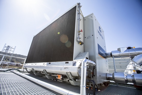 El nuevo habitáculo está provisto de un sistema antincendios por aspiración y cuenta con bombona de extracción de gas Novec que apaga por enfriamiento. Las tuberías se han distribuido por el techo y dispone de cuatro circuitos hidráulicos que están conectados a dos chiller (que podrían ampliarse a cuatro): se trata de dos enfriadoras con sistema diabático que logran el freecooling hasta 18 grados (en la foto). Esto hace posible que el 70-75% de las horas del año trabajadas sean sobre freecooling, ha matizado el responsable, lo que redunda en la eficiencia de esta sala técnica, en tanto en cuanto se posicionan en un PUE de 1.32 (con el objetivo de llegar al 1.25) y 23 grados. Asimismo, a través de un sistema de “Inteligencia Artificial” aplicada a los equipos de monitorización y control, la temperatura del pasillo frío se consigna y las máquinas se van regulando en función de las necesidades térmicas. Para ello se han dispuesto cuatro sensores en cada pasillo frío.