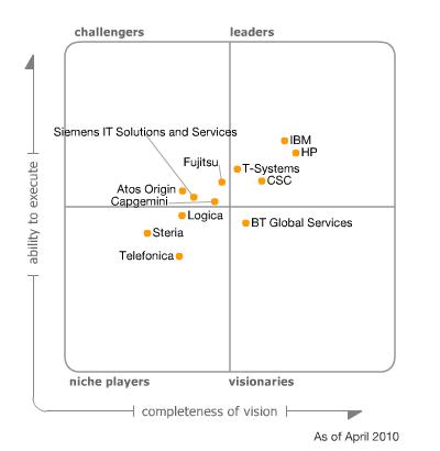 En el cuadrante de Líderes, Gartner ha situado a IBM, HP, T-Systems y CSC; en el de Challengers a Fujitsu, Atos Origin, Siemens IT Solutions and Services, y Capgemini; en el área de Jugadores de Nicho, figuran Logica, Steria y Telefónica; y como Visionarios tan sólo se encuentra BT Global Services.