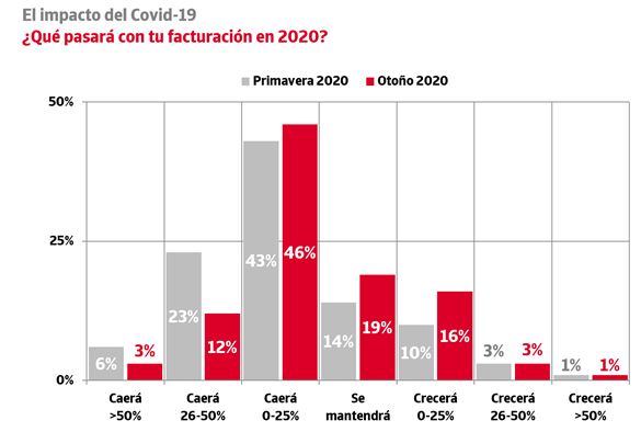 El 61% de las empresas españolas esperan una caída de su facturación en 2020 frente al 19% que prevén mantener sus ingresos y un 20% que espera un incremento. Los datos forman parte de la segunda oleada del Estudio del Riesgo de Crédito en España impulsado por Crédito y Caución e Iberinform, que permite comparar las actuales previsiones empresariales con las que expresaron durante el confinamiento de primavera a causa de la Covid-19. La oleada de otoño confirma el fuerte impacto en el desempeño empresarial, pero suaviza el golpe frente a las previsiones de primavera, cuando las empresas esperaban que la caída de ingresos alcanzase el 72%.