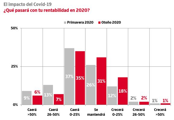 Las previsiones sobre el impacto en la rentabilidad de 2020 muestran la misma evolución. Las empresas que prevén una caída de la rentabilidad se reducen al 48%, once puntos menos que en primavera. En ambas oleadas, los efectos económicos de la pandemia esperados por las empresas son más suaves sobre la rentabilidad que sobre los ingresos, un indicador del intenso trabajo que está realizando el tejido empresarial sobre su estructura de costes para poder adaptarse a los nuevos niveles de actividad.