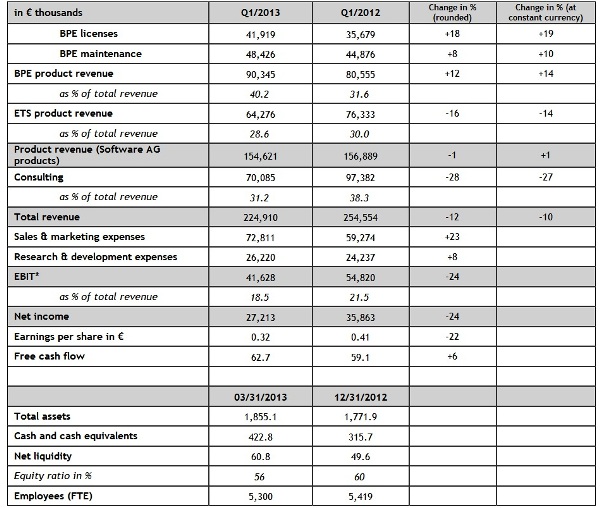 Este declive se ha debido principalmente por la disminución de los ingresos de su negocio de consultoría, -que comprende los servicios de BPE, ETS e IDS Scheer Consulting-, que han sido de 70,1 millones de euros frente a los 97,4 millones obtenidos en 2012. Explica el fabricante alemán que esto se debe a la reorganización de su negocio de consultoría SAP, pues Software AG sigue apostando por retirarse de los mercados no rentables para centrarse en la optimización de procesos para aplicaciones SAP en los países de habla germana. La venta de las actividades de los servicios relacionados con SAP en América del Norte en enero de 2013 fue un paso importante en esta dirección.
