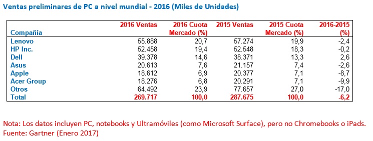Las ventas de PC en todo el mundo siguen a la baja, aunque dan síntomas de cierta estabilización. Según Gartner, se comercializaron en todo el planeta durante el ultimo trimestre del pasado año 72,6 millones de máquinas (entre sobremesas y portátiles de todo tipo), un 3,7% menos que en el mismo periodo de 2015. IDC, que también ha sacado cifras de venta, aminora la caída y la deja en el 1,5%. Durante todo el año, los fabricantes pusieron en el mercado casi 270 millones de ordenadores, un 6,2% menos, según Gartner. El mercado de PC lleva cayendo invariablemente cada año desde 2012, aunque cada vez en menor medida, puesto que hay que recordar que hubo ejercicios con descensos por encima del 10%.