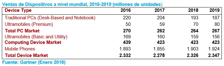 El mercado mundial de dispositivos (PC, tabletas y smartphones) ha totalizado 2.280 millones de unidades vendidas en 2017, de acuerdo con Gartner; las previsiones para 2018 es que alcancen 2.320 millones, lo que representa una subida del 2,1%.