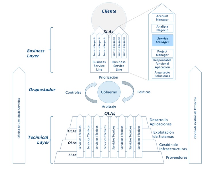 • Technical Layer (TL). Formada por equipos técnicos de entrega de servicios que construyen, despliegan, explotan y mantienen, bajo la supervisión de la Business Layer, los productos y servicios diseñados.
