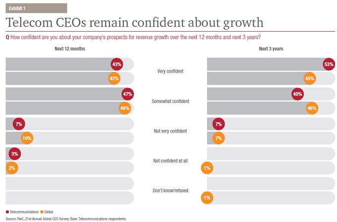 De la encuesta elaborada por PwC, se desprende que los líderes del sector de Telecomunicaciones permanecen optimistas sobre su futuro cercano a pesar de la amenaza que supone la disrupción digital. Ven con buenos ojos la situación económica mundial y la de sus propias compañías. Están invirtiendo en automatización, lo que no es obstáculo para incrementar su fuerza laboral. Otro apunte que realizan es en torno a los ciberataques y las regulaciones de los diferentes Gobiernos, aunque piensan que por el momento las gestionan de forma efectiva.