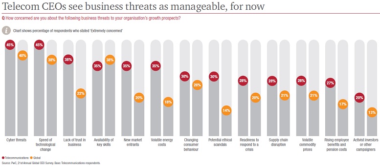• Ciberamenazas: Las ciberamenazas son la otra cuestión que quita el sueño a los líderes de las empresas de Telecomunicaciones: así lo refleja el 45% de los CEOs que reconoce estar ‘extremadamente preocupado por este tema’. Lo cierto es que los ciberataques son especialmente sensibles en este sector, ya que estas empresas manejan no solo sus propios datos, sino también información de muchas otras compañías y clientes. Si las ‘telecos’ no consiguen garantizar la privacidad de los datos de sus clientes, el e-commerce no conseguirá desarrollar todo su potencial.
