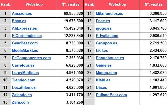 El portal de ahorro Cuponation.es ha elaborado un ranking de e-commerce en España por número de visitas mensuales. En primera posición se encuentra el gigante Amazon.es, con 69,8 millones de visitas. Le siguen Ebay.es con 19,6 millones, y AliExpress.es con 15,4. El primer comercio con sello español es ElCorteIngles.es en cuarta posición, con 12,2 millones de visitas mensuales.