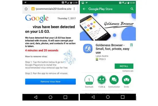 - Scareware: Otra de las acciones de AdultSwine es asustar a los usuarios para que instalen aplicaciones de ‘seguridad’ innecesarias y dañinas. En primer lugar, muestra un anuncio que afirma que un virus ha infectado el dispositivo. Al seleccionar la acción ‘Eliminar Virus Ahora’, el usuario se dirige a otra aplicación de la Google Play, que en realidad es otro malware.