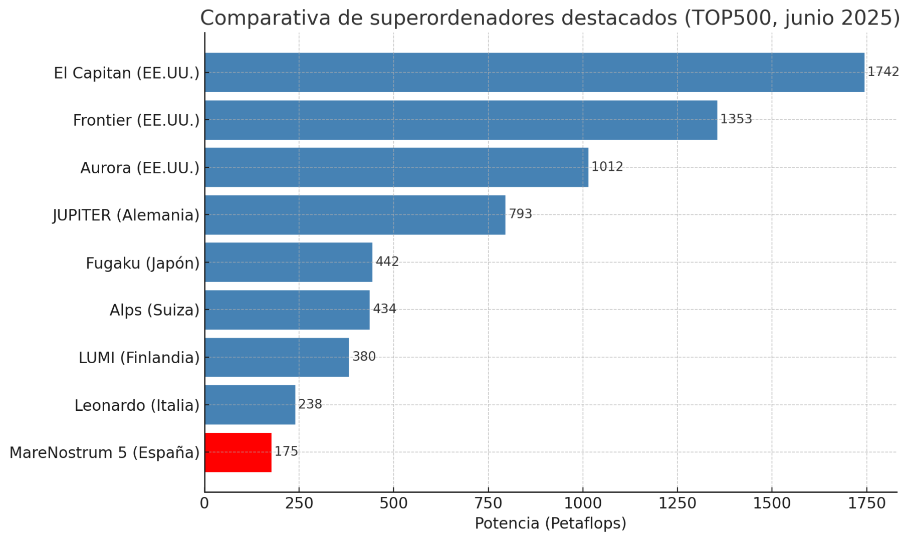La era de la exaescala ya es una realidad. El último ranking TOP500, publicado en junio de 2025, confirma que tres superordenadores estadounidenses superan ya el exaflop, el equivalente a un quintillón de operaciones por segundo. El Capitan se mantiene al frente del TOP500 con un rendimiento de 1.742 PFlop/s en la prueba HPL. Este superordenador instalado en el Laboratorio Lawrence Livermore (California) utiliza procesadores AMD EPYC de cuarta generación y aceleradoras Instinct MI300A. Tras él se sitúan Frontier (Oak Ridge) con 1.353 PFlop/s y Aurora (Argonne) con 1.012 PFlop/s. Las tres máquinas, financiadas por el Departamento de Energía de Estados Unidos, confirman el liderazgo norteamericano en esta carrera.