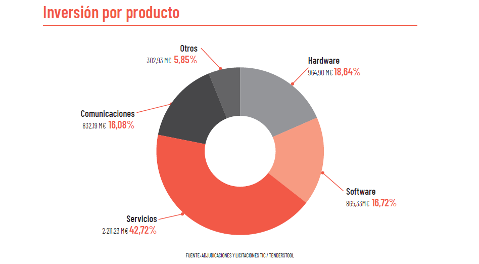 Uno de los aspectos más relevantes del análisis reside en la clasificación de la inversión por categorías tecnológicas. Durante el periodo estudiado, la categoría con mayor peso fue la de Servicios, con 2.211,23 millones de euros, lo que equivale al 42,72% del total. Este predominio confirma que la Administración pública está priorizando la externalización, el soporte especializado, la integración tecnológica y los servicios gestionados.