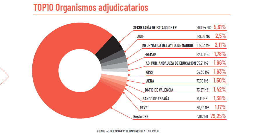 Le siguen Informática del Ayuntamiento de Madrid (109,33 M€; 2,11%), FREMAP, Agencia Pública Andaluza de Educación, GISS, AENA, la Dirección General de Tecnologías de la Información y las Comunicaciones de Valencia, Banco de España y RTVE, todos ellos con porcentajes relevantes dentro del global.
