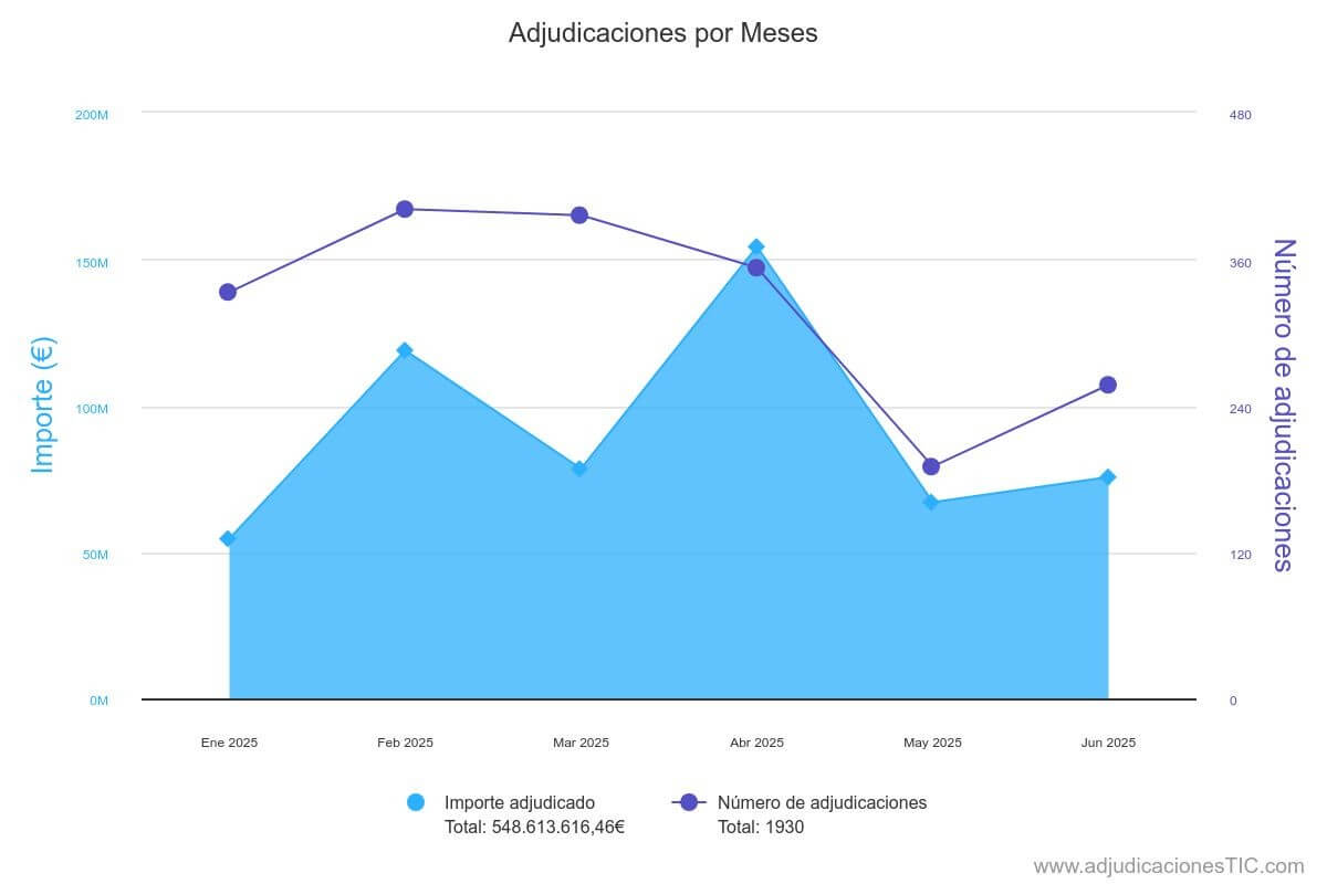 Ante el déficit tecnológico europeo, el apoyo institucional para la industrialización tecnológica europea es clave. Según TenderTool, plataforma de seguimiento y análisis de licitaciones y adjudicaciones públicas, muestra que en el primer semestre de 2025 la Administración española adjudicó contratos de hardware por un importe total de 548 millones de euros, con asignaciones mensuales que oscilaron entre 54 millones y 154 millones. El gasto alcanzó su punto máximo en abril, coincidiendo con procesos de licitación de gran escala.