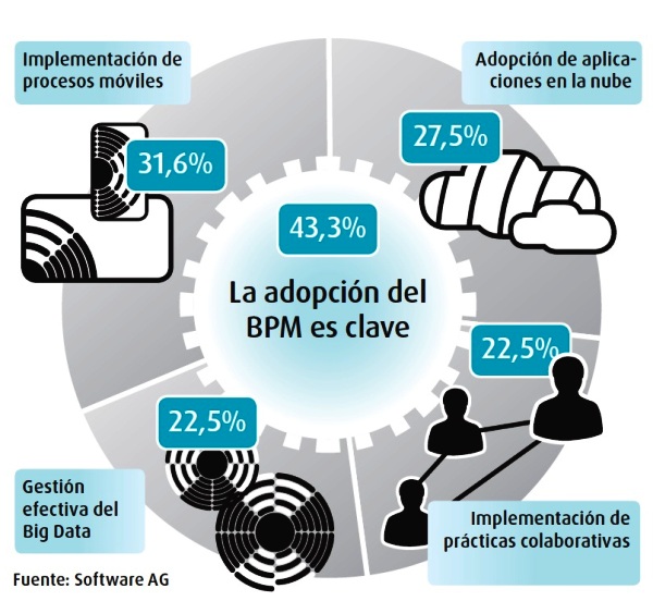 Los datos revelan que más de un 20% de los entrevistados cree que la gestión del Big Data y la colaboración son las tecnologías que permiten obtener más oportunidades de negocio. Por su parte, el cloud computing y las aplicaciones móviles fueron escogidas por más del 30%; y más del 40% señala al BPM (gestión de los procesos de negocio) como el principal motor de la empresa digital.