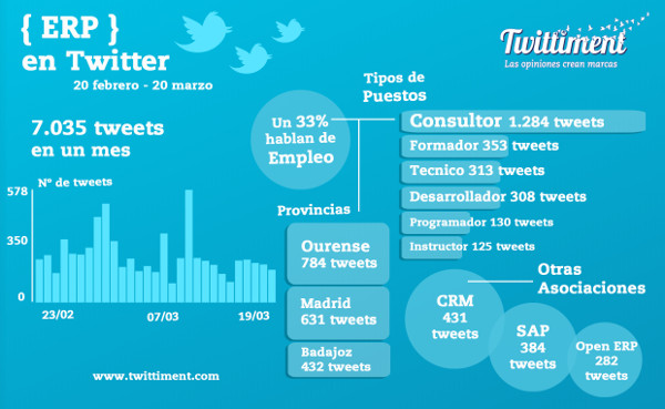 Twittiment, empresa especializada en medir la red de los 140 caracteres, ha registrado durante dicho mes unos 7.000 tweets que hacen referencia a los sistemas ERP. Sin que cuantitativamente sea del todo relevante, sí se aprecia su valor cualitativo. Lo más destacable, es que el 33% de los tweets estaban relacionados con ofertas de empleo. Dentro de este ámbito, el puesto de consultor (que recoge 1.284 comentarios) es claramente el más demandado. Desde el punto de vista geográfico, las ofertas de empleo más difundidas han sido en Orense y Madrid. Temas relacionados con los sistemas ERP fueron el CRM (6% del total), SAP (5%) y el Open ERP.
