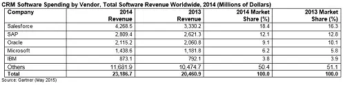 Los 10 principales proveedores del mercado CRM cuentan con más del 60% de cuota de mercado en 2014, unos 14.000 millones de dólares, con un aumento en este aspecto del 14% sobre 2013. Sin embargo, salvo las excepciones de Salesforce y Microsoft, la mayoría de los vendedores situados en las 10 primeras posiciones o bien mantenieron su puesto o perdieron protagonismo y cuota.