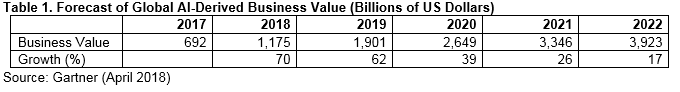 Se estima que el mercado de la inteligencia artificial crezca en 2018 hasta alcanzar un volumen de negocio de 1,2 billones de dólares, impulsado por las soluciones de IA orientadas a la experiencia del cliente (CX), y los progresos conseguidos en sistemas de redes neuronales profundas (DNN).