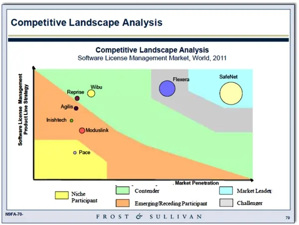 En su análisis, Frost & Sullivan ha reconocido a SafeNet como único líder de este segmento por su efectiva y atractiva estrategia de línea de producto; en el campo de Challenger ha situado a Flexera; en Competidores a tener en cuenta a Wibu y Reprise; en Participantes Emergentes a Agilis, Inishtech y Moduslink; y finalmente en los Participantes de Nicho a Pace.
