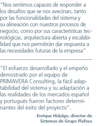 El proyecto de implementación del fue desarrollado por PRIMAVERA Consulting de acuerdo a la Metodología de Implementación de PRIMAVERA (MIP). Esta metodología contempla las mejores prácticas internacionales y técnicas de modelación de sistemas, que unido a la experiencia y know how del equipo de consultoría de PRIMAVERA, ofrecía una total garantía de éxito de un proyecto de la envergadura de Grupo Plafesa.