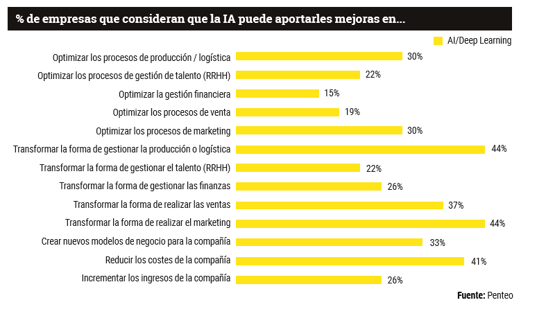 Análisis de información: La inteligencia artificial dedicada a la analítica de información es uno de los ámbitos donde hay mayor implantación, aunque sigue estando lejos de estar extendida en una mayoría de empresas (solo el 35% dispone de algún sistema).