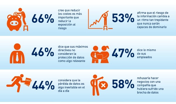 En este informe también ha quedado evidente que el 75% de las empresas reconoce que una actitud responsable frente a la información es esencial para el éxito, y un 43% cree que el riesgo de una brecha de datos va a ser mayor. Esto, sin embargo, no se traduce en acción: un 46% dice que la dirección de la compañía no considera la protección de datos como algo relevante; un 47% dice lo mismo de sus empleados; y el 66% cree que reducir los costes es más importante que reducir la exposición al riesgo.