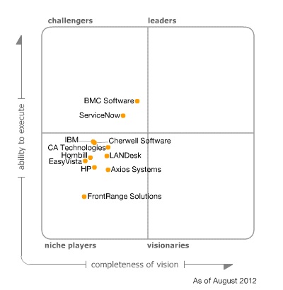 Sorprende de este Cuadrante, que según los criterios de evaluación de Gartner, ningún proveedor ha obtenido el reconocimiento de Líder ni de Visionario de este mercado. Prácticamente, todos los fabricantes se han aglutinado en la categoría de Jugadores de Nicho como IBM, Cherwell Software, CA Technologies, Hornbill, LANDesk, EasyVista, HP, Axios Systems y FrontRange Solutions. Tan sólo BMC Software y ServiceNow figuran en el cuadrante de Challengers.