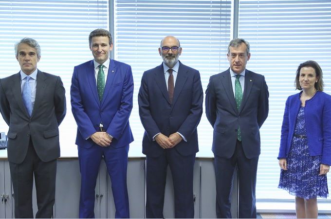 (De Izquierda a derecha: Borja Ochoa, director de Servicios financieros de Minsait; Víctor Manuel Martín director general de Eurocaja Rural; Fernando Abril – Martorell, presidente de Indra; Javier López Martin, presidente de Eurocaja Rural; y Cristina Ruiz Ortega, consejera directora general del negocio de TI de Indra)
