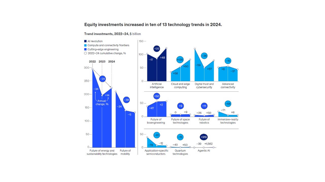En nuevo informe ‘McKinsey Technology Trends Outlook 2025‘, que analiza las primeras 13 tendencias tecnológicas, indica que la IA se ha consolidado como el gran motor de la transformación tecnológica global, al concentrar en 2024 más de 124.300 millones de dólares en inversión de capital.
