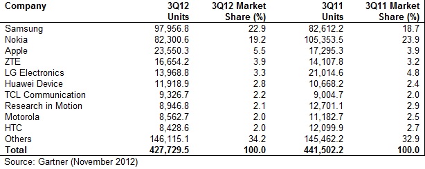 Las ventas a nivel mundial de teléfonos móviles para usuario final alcanzaron cerca de 428 millones de unidades en el tercer trimestre de 2012, lo que representa una bajada del 3,1% frente al mismo trimestre de 2011, de acuerdo con Gartner. Los smartphone representaron un 39,6% del total de ventas, incrementándose en un 46,9%.
