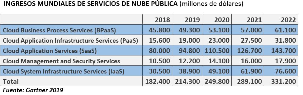 Gartner prevé que el mercado mundial de servicios de nube pública crecerá un 17,5% en 2019 hasta un total de 214,3 mil millones de dólares, frente a los 182,4 mil millones de dólares que creció en 2018. El segmento de mercado de más rápido crecimiento será el de los servicios de infraestructura de sistemas en la nube, o infraestructura como servicio (IaaS), que se prevé que crezca un 27,5% en 2019 hasta alcanzar los 38,9 mil millones de dólares, frente a los 30,5 mil millones de dólares que obtuvo en 2018. La segunda tasa de crecimiento más alta será del 21,8% y se logrará mediante servicios de infraestructura de aplicaciones en la nube, o plataforma como servicio (PaaS).