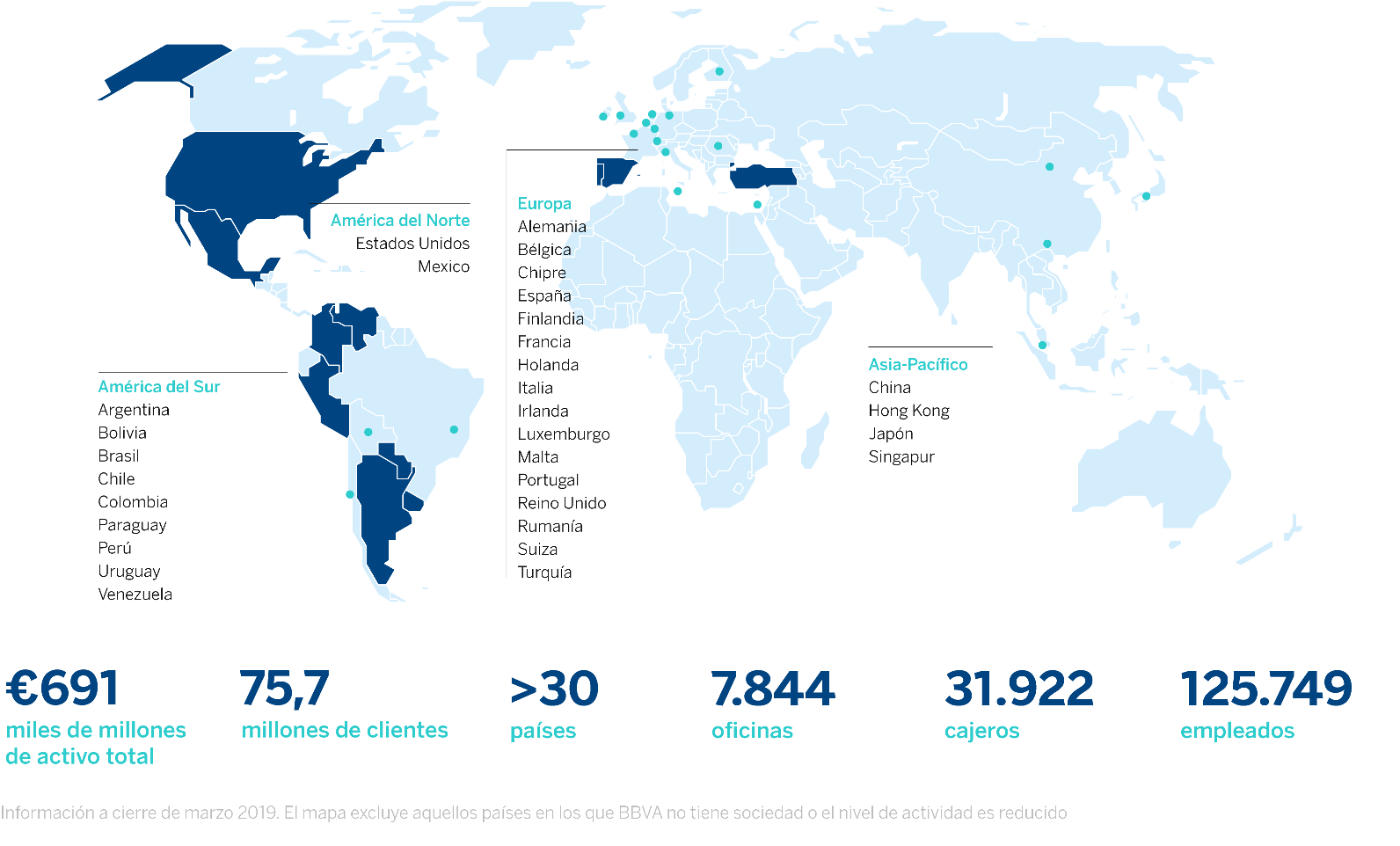 BBVA es un grupo financiero global fundado en 1857. Tiene una posición de liderazgo en el mercado español, es la mayor institución financiera de México y cuenta con franquicias líder en América del Sur y la región del Sunbelt en Estados Unidos. Además, es el primer accionista de Garanti, en Turquía. Su negocio diversificado está enfocado a mercados de alto crecimiento y concibe la tecnología como una ventaja competitiva clave. La responsabilidad corporativa es inherente a su modelo de negocio, impulsa la inclusión y la educación financieras y apoya la investigación y la cultura. BBVA opera con la máxima integridad, visión a largo plazo y mejores prácticas.