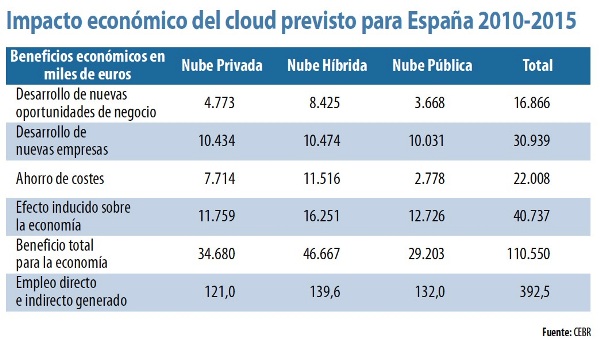 Este año, se prevé que el cloud computing mueva un volumen de negocio en nuestro país de 1.800 millones de euros, según datos de Ametic. Si atendemos a esta cifra de inversión, la generación de Valor Añadido Bruto (VAB) se calcula será superior a los 2.730 millones de euros, lo que a su vez tendrá un impacto de 3.049 millones de euros en el Producto Interior Bruto (PIB) de 2012. De estos datos se extrae, entonces que por cada euro invertido, el impacto generado en términos de PIB será de 1,63 euros.