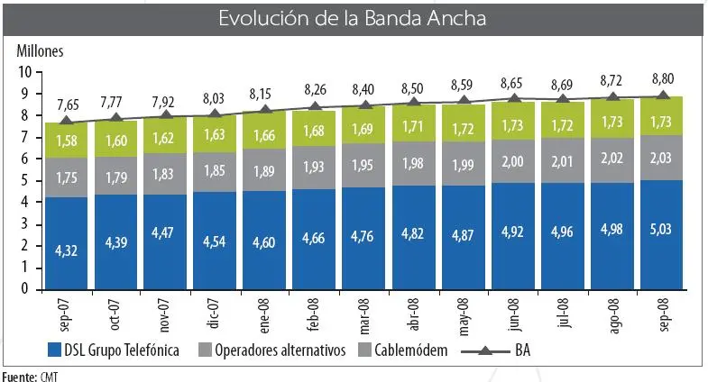 Según los datos proporcionados por los operadores a la Comisión del Mercado de las Telecomunicaciones, en septiembre de 2008, había en nuestro país 51,7 millones de líneas de telefonía móvil automática, un 5,5 por ciento más que en la misma fecha del año anterior, para una población de 46,1 millones de personas. De esta cifra, 50,4 millones corresponden a líneas de abonados lo que supone casi un 5 por ciento más que en septiembre de 2007. Estos datos sitúan a España en una tasa de penetración del 111,4 por ciento (es decir, 111,4 líneas por cada 100 habitantes). En este último informe de la CMT, se observa un claro ascenso de las líneas de postpago con más de 30 millones y un 9,4 por ciento, frente a un descenso de las líneas de prepago, un 1 por ciento, que alcanzaron la cifra de 20,3 millones.