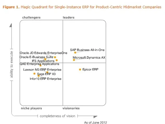 En conclusión, Gartner ha reconocido como Líderes tan solo a SAP, por su solución Business All-in-One, y a Microsoft por Dynamics AX. Ha situado en el cuadrante de Challengers a las siguientes soluciones: Oracle JD Edwards EnterpriseOne; Oracle eBusiness Suite; e IFS Applications. Ha identificado como Jugadores de Nicho a Quad Enterprise Applications; Lawson M3 ERP Enterprise; Sage ERP X3; e Infor 10 ERP Enterprise. Finalmente, en el área de Visionarios solo ha colocado a Epicor ERP.