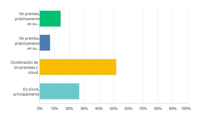 Según el análisis realizado, el 52% de las empresas están combinando on premise y cloud, mientras que el 27% tienen principalmente su información en la nube. Es destacable que casi un 15% se mantienen on premise y no contemplan migrar a la nube; solo un 7% se plantea ir al cloud en el corto-medio plazo.