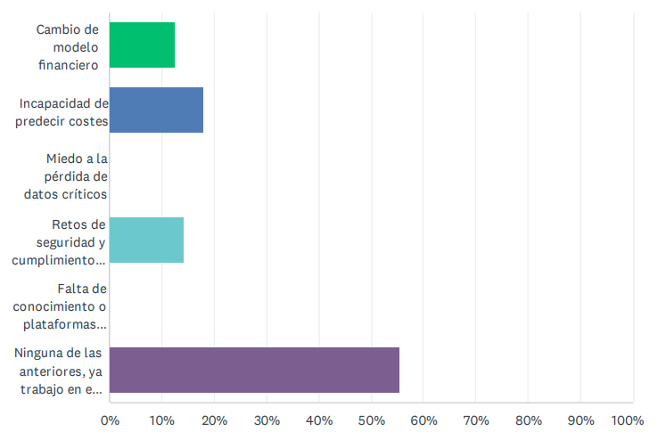 Ante los nuevos desafíos de la migración cloud se planteó cuáles eran las razones que dificultaban este paso. Dentro de esa minoría que no tienen datos en la nube, las principales causas eran la incapacidad de predecir costes, los retos de seguridad y cumplimiento normativo; otro factor era el cambio de modelo financiero.