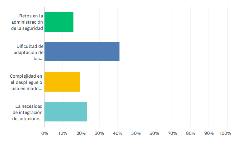 Una cuestión enfocada a quienes sí han migrado era cuáles habían sido los retos tecnológicos a los que se habían tenido que enfrentar. En este sentido, más del 40% afirmaban que el hándicap había sido la dificultad de las aplicaciones legacy; el 23% destacaba la necesidad de integración de soluciones dispares que no siempre responden al uso de una API, y casi el 20% destacaban la complejidad en el despliegue o uso en modo híbrido o multicloud. Otro reto que destacaron fueron los retos en la administración de la seguridad.