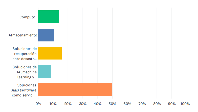 Otra pregunta interesante era qué tipo de cloud se usa. En este sentido, el 50% apostaban por soluciones SaaS; el 16% las soluciones de recuperación y los back up. También se ha apostado por el cómputo y por las soluciones de IA, ML y gestión de datos.