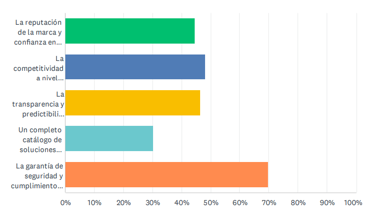 Otra pregunta realizada en la encuesta de Computing eran los factores que consideran clave para elegir un proveedor cloud. El 70% de respondían que la garantía de seguridad y cumplimiento normativo. Otros factores que se tienen bastante en cuenta son la competitividad a nivel rendimiento-precio, la transparencia y predictibilidad de los precios y la reputación de la marca y confianza en sus servicios.