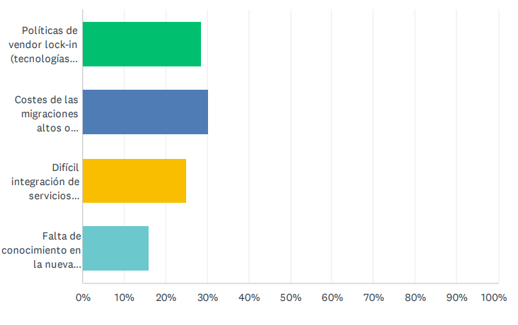 Al preguntar las razones que podrían dificultar el cambio de proveedor las respuestas son más ajustadas. Se observa que el lock-in y los costes de las migraciones son los principales retos a los que se enfrentan los directivos TI y tener un buen proveedor puede marcar la diferencia en estos aspectos.