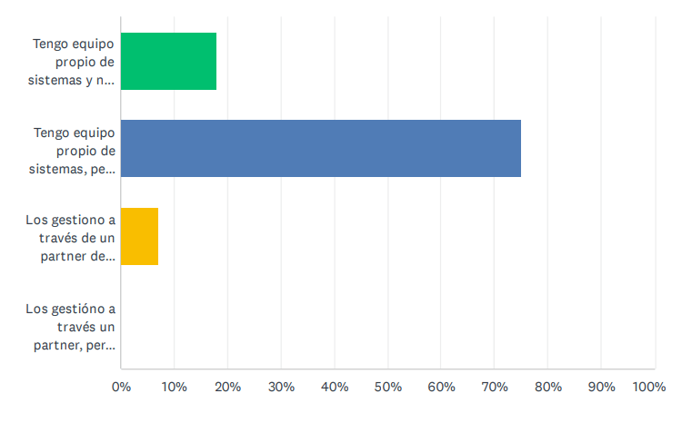 Los proyectos tecnológicos de las personas encuestadas en su inmensa mayoría se gestionan con equipos propios de sistemas, pero en algunos proyectos se ayudan de partners. Casi el 18% afirmaban que tenían equipos propios y no necesitaban soporte y un 7% lo gestionaban con sus partners de confianza.