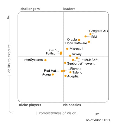 A la hora de otorgar los diferentes reconocimientos que Gartner aplica en su cuadrante, ha evaluado a los fabricantes en función de su visión integral y de su capacidad de ejecución. Así, ha identificado como Líderes a Software AG, IBM, Oracle, Tibco Software, Microsoft y Axway. Ha reconocido como Challengers a SAP y Fujitsu; ha situado en el campo de Jugadores de Nicho a InterSystems, Red Hat y Aurea; y en el cuadrante de Visionarios ha ubicado a MuleSoft, Seeburger, WSO2, Fiorano, Talend y Adeptia.