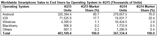 Las ventas globales de smartphones para usuarios finales fueron de 403 millones de unidades en el cuarto trimestre de 205, lo que representa una subida del 9,7% sobre el mismo periodo de 2014, según Gartner. Sin embargo, es el crecimiento más bajo desde 2008. En cuanto al año 2015, las ventas de smartphone alcanzaron 1.400 millones de uniades, un incremento del 14,4% con respecto a 2014.