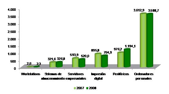 Según datos ofrecidos por ASIMELEC, el mercado del hardware informático alcanzó en el año 2008 el volumen de facturación de 6.396,8 millones de euros, lo que se traduce en un mínimo retroceso de un 0,1 por ciento respecto a la cifra registrada en el año 2007.