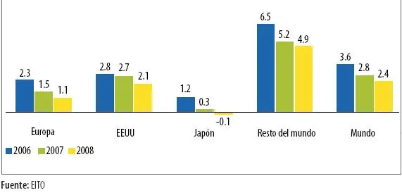 El mercado mundial de servicios de telecomunicaciones alcanzó en 2007 los mil millardos de euros, más de la mitad se obtuvieron en servicios móviles, seguidos de telefonía fija y, por último, Internet. La evolución del sector de las comunicaciones electrónicas fue, en líneas generales, positiva, aunque al igual que el mercado de las TI el porcentaje de crecimiento sigue decreciendo. La media mundial de crecimiento ha sido del 2,8 por ciento, según informe de EITO (European Information Technology Observatory), experimentándose un mayor crecimiento fuera de los mercados de Europa, Estados Unidos y Japón. Para el próximo año, se espera que continúe esta tendencia alcanzando un 2,4 a nivel mundial y Japón entraría en un crecimiento negativo con un -0,1 por ciento, mientras que Estados Unidos obtendría un 2,1 por ciento, Europa un 1,1, y un 4,9 el resto del mundo. Del total del mercado, que alcanza los 1.137 billones de Euros, Europa factura un 31,7 por ciento, Estados Unidos un 20,5, Japón un 13,8 por ciento y el resto del mundo un 33,9 por 100.