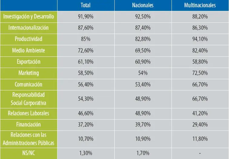 El informe ‘La gestión empresarial en 2007’ de IESE IRCO señala que la I+ D (91,9 por ciento) se contempla como el factor más importante de futuro, seguido por la Internacionalización (87, 6 por ciento) y la Productividad (85 por ciento). La Investigación y Desarrollo se consolida de este modo en el primer puesto en orden de importancia ya manifestado en años anteriores. La Internacionalización, por su parte, escala posiciones y desplaza a la Productividad como segundo factor más importante para el futuro. En cuanto a los factores menos importantes en el ejercicio 2007, los directivos encuestados destacan, siguiendo exactamente el mismo orden del ejercicio anterior, las Relaciones con las Administraciones Públicas (79,9 por ciento), la Financiación (50 por ciento) y las Relaciones Laborales (, 6 por ciento).