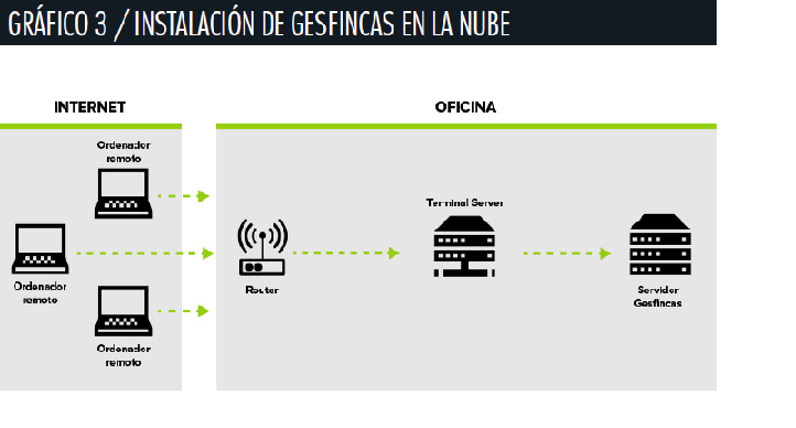 Esta solución tiene la ventaja que no necesita tener ordenadores en la oficina, puesto que las sesiones se abren directamente contra el servidor. Es decir, cualquier PC, esté fuera o dentro de la oficina, puede abrir un Gesfincas.