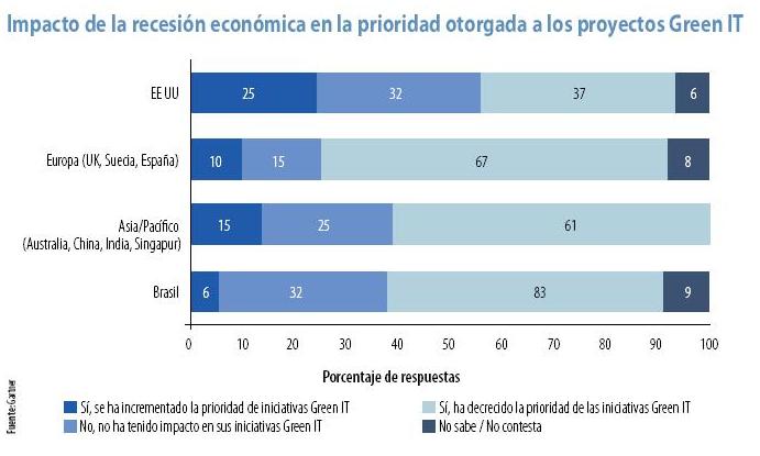 La recesión está llevando consigo sensibles recortes en todos los proyectos. Incluso los programas Green ITse están viendo afectados; pero una reciente encuesta de Gartner indica que la mayoría de las organizaciones mantendrán sus proyectos relacionados con esta materia. Un significativo número de corporaciones, particularmente de Estados Unidos y Brasil, anticiparon sus intenciones de reducir sus proyectos de Green IT durante 2009. Sin embargo, en la mayoría de los casos, especialmente en Europa y en el área Asia/Pacífico, la recesión no va a cambiar las cosas o, en cualquier caso, se va a producir un incremento de la prioridad de este tipo de programas. Gartner también preguntó a los directivos que tenían bajo su responsabilidad la gestión del gasto sobre este apartado (el 22 por ciento de los encuestados), qué proporción tenía sobre la inversión global en TI. De modo genérico, más de un tercio de los responsables (46 por ciento en Europa, 38 por ciento en Asia/Pacífico y 36 por ciento en Estados Unidos) manifestaron que Green IT representaba más del 15 por ciento de sus presupuestos en tecnologías de la información.