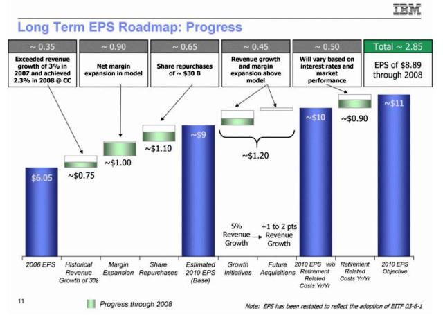 Ahora, la compañía asegura estar en camino de conseguir sus objetivos a pesar de que en sus últimos resultados correspondientes al segundo trimestre, las ventas bajaron un 13,3 por ciento. La facturación, por tanto, fue de 23.250 millones de dólares pero el beneficio neto subió un 12,2 por ciento sumando 3.100 millones de dólares. Dado el férreo control de los gastos y su disciplina a la hora de cerrar acuerdos, IBM de nuevo revisa al alza sus previsiones pasando de 9,20 a 9,70 dólares por acción en 2009.