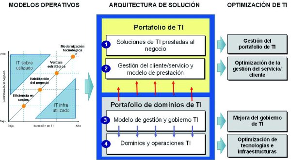 - Las expectativas y demandas del negocio deben ser traducidas al entorno de TI y para ello, la arquitectura de solución y el portafolio de TI son dos herramientas clave. La arquitectura de solución ordena y contextualiza los recursos de TI de cara al negocio. A partir de ella se obtienen los elementos que forman el portafolio de TI (soluciones ofrecidas al negocio: aplicaciones, procesos de negocio, recursos, servicios,…) y el portafolio de dominios de TI (tecnologías que soportan las soluciones prestadas en el portafolio de TI). Los portafolios proporcionan una aproximación ordenada y estructurada para la mejora de TI.